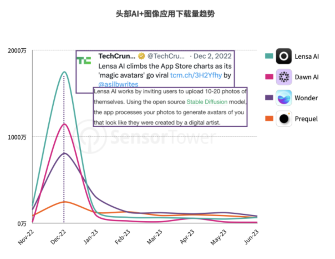 根据数据分析公司Sensor Tower的统计,Lensa从去年11月中旬开始下载量上升,12月中旬到达顶峰,今年1月中旬回落到低水平,整个生命周期的热度也就两个月时间。其他头部AI+图像应用也是几乎完全相同的轨迹。