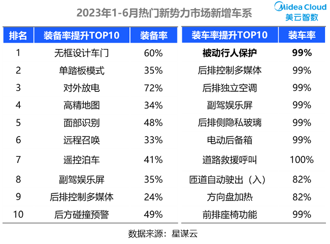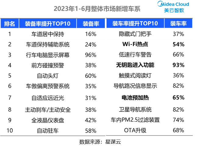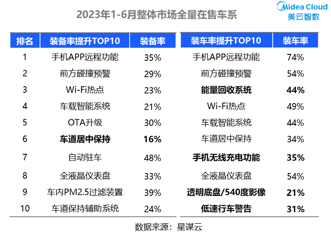 从存量在售车市场看,配置装备率与装车率都同比有提升的,有智能化方面的手机APP远程功能、Wi-Fi热点、OTA升级;有主动安全相关的前方碰撞预警、车道居中保持;在装车率提升TOP10中,有差异的配置为“能量回收系统、手机无线充电功能、透明底盘/540度影像”等。