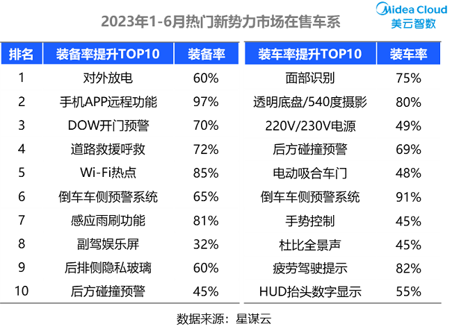 从选定的新势力在售车型市场来看,装备率与新能源市场类似,提升最快的主要为手机APP远程功能、对外放电、DOW开门预警、WI-Fi热点等配置。从装车率提升来看,多数与“智能座舱”相关,如面部识别、手势控制、人车互动等;疲劳驾驶提示、HUD抬头数字显示、杜比全景声……主打车内“智趣生活”。