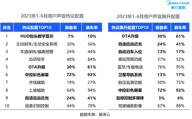 装备率反映的是主机厂的主动动作,装车率间接反映消费者对配置需求的变化,在汽车配置市场中,主机厂也更关注用户偏好。通过对各平台的用户评价进行海量文本分析,我们统计出用户热议、关注的配置,以及用户评论飙升的配置。