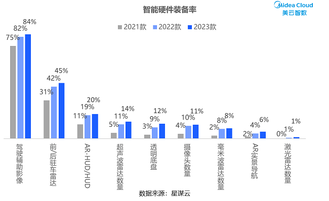 在智能汽车一路“驰”行的风口下,汽车高级驾驶辅助系统(ADAS)的渗透率不断提升,智能硬件成为“兵家必争之地”。对比个别车企2021款车型,2022及2023款车型智能硬件装配提升明显,其中与智能驾驶相关的传感器(雷达、摄像头)增长率达5%及以上。