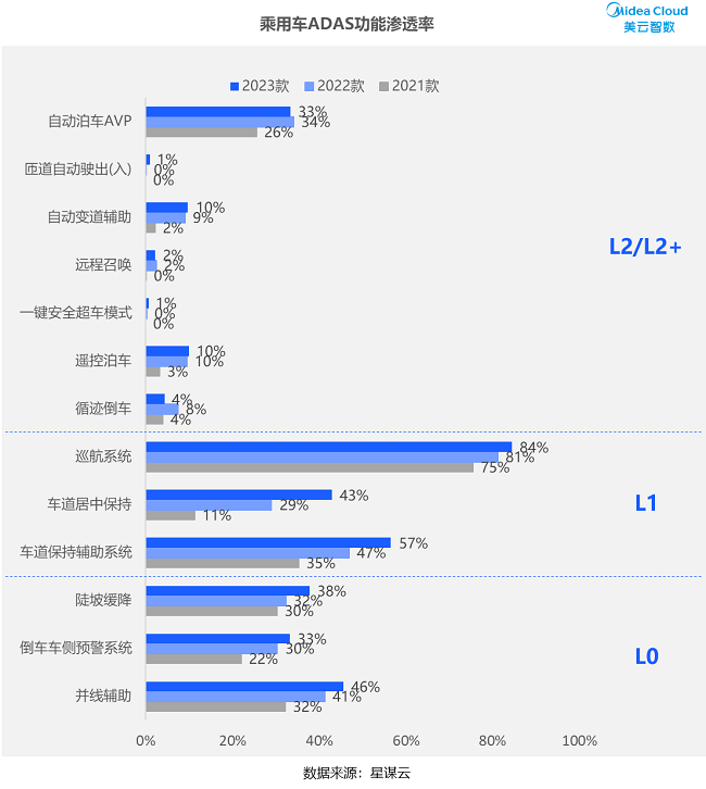 大部分车型智能硬件装配已满足L2自动驾驶,但对应ADAS功能未必满配。对比2021-2023款车型,L0与L1功能装配率已达30%及以上,巡航系统也几乎成为标配。但L2与L2+功能装配率低(不达10%),大部分为高端车型或热门车型选配。自动泊车AVP作为场景类的有条件自动驾驶,因其L3试点应用性质与日常实用性,装配率要高于同级其他。