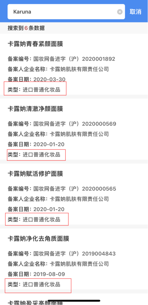“小昭的生活馆”淘宝店所宣称的Karuna卡露妠面膜具有美白提亮等功效。而根据国家现行法律法规(例如《化妆品监督管理条例》等),美白类化妆品应属于“特殊用途化妆品”,但记者在化妆品监管APP上查询的产品信息发现,Karuna卡露妠所涉及的系列面膜单品(其中包含店铺宣称的美白面膜),其备案类型均显示为“进口普通化妆品”,而并非“特殊用途化妆品”。