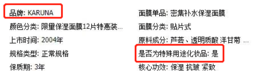 此外,《化妆品报》还发现,在该店的Karuna卡露妠商品详情页中,“是否为特殊用途化妆品”那一栏资料,显示的为“是”。而在化妆品监管官网上,记者查询到的同一款产品却显示为“普通进口化妆品”。