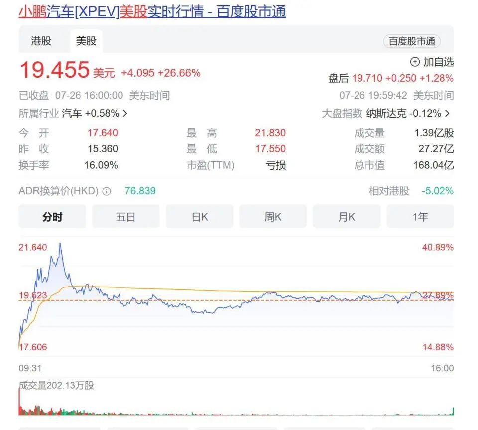 消息发布后,小鹏汽车股价迎来暴涨。7月26日,小鹏汽车美股盘中股价一度涨超40%。截至收盘,股价涨26.69%,报19.46美元,股价创一年来新高。