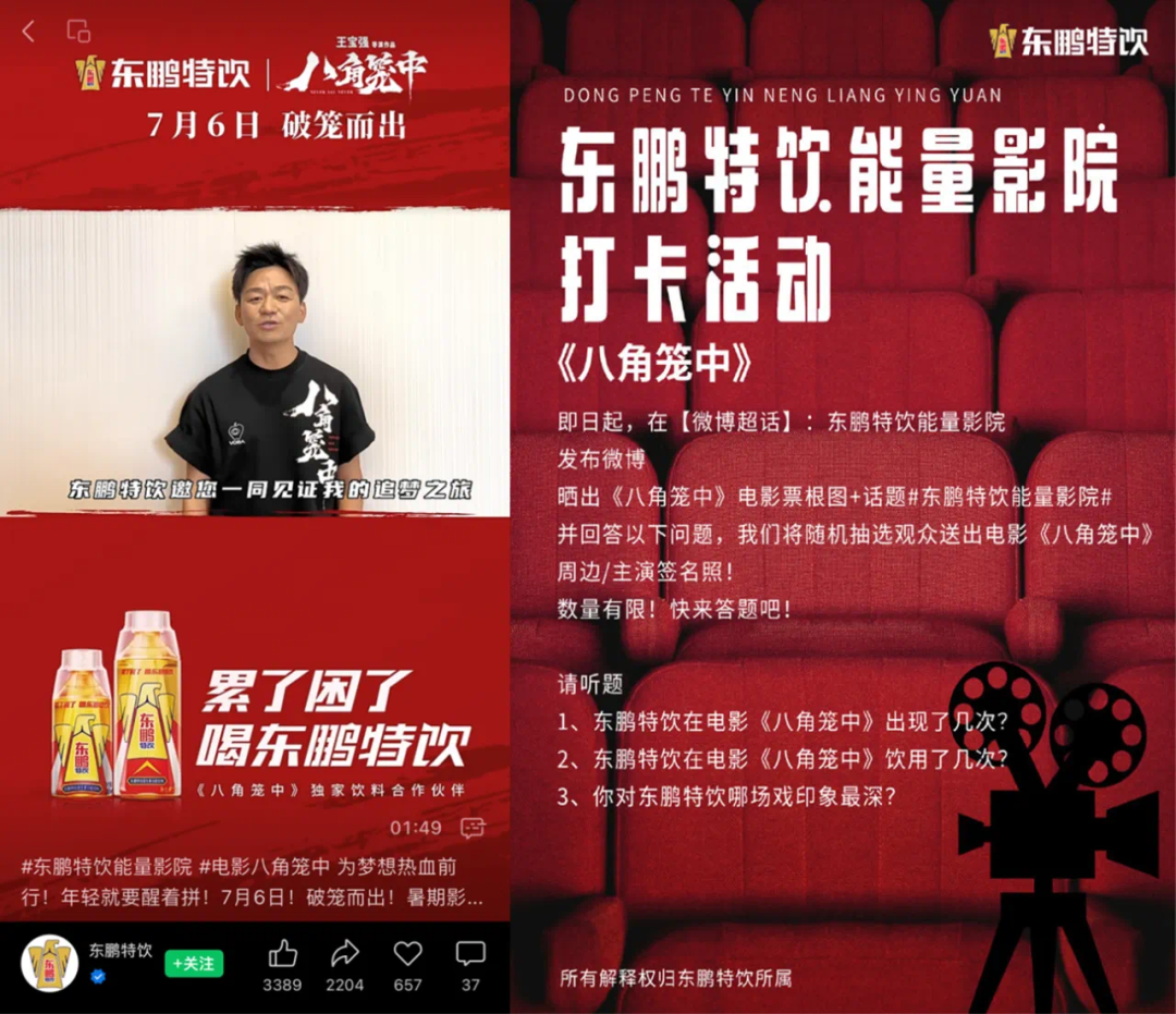 比如在今年暑期档中《八角笼中》与东鹏特饮的合作案例中,东鹏特饮本就强调运动竞技场景,《八角笼中》讲述的又是格斗故事,暗含冲破枷锁、重获新生的内核,搭载电影IP,品牌把价值观暗藏于电影叙事中,潜移默化间让观众产生了联想和信任。