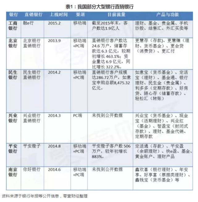 据易观智库统计,60%以上的直销银行推出了货币基金、银行理财及存款产品,其次是贷款、转账、缴费及贵金属业务,少数直销银行也推出了保险及信用卡业务,而作为融资平台使用的直销银行也有不少,其中21%的直销银行推出了网络投融资服务。笔者整合了几家较为知名的直销银行相关资料。