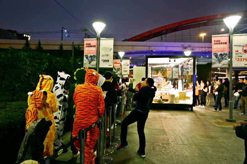 上周五晚上,在上海的三家宜家门店里,就出现了一群群穿着奇异的年轻人。他们把自己打扮成了绿色的卡通恐龙、黑白相间的奶牛和长颈鹿,像是一场PK谁更可爱的Cosplay大会。