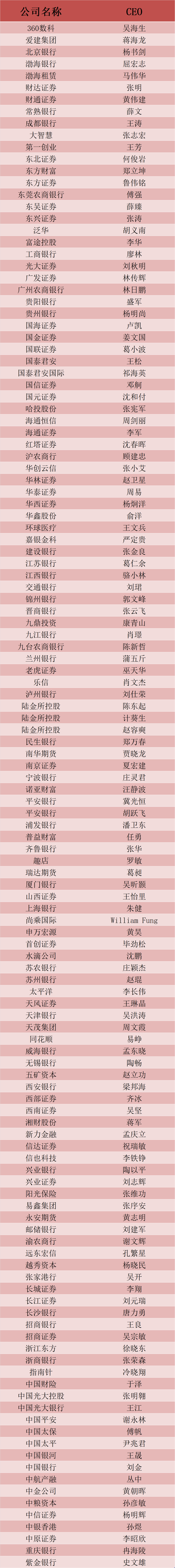 界面新闻2023年度金融行业CEO入围名单(以公司名称为序):