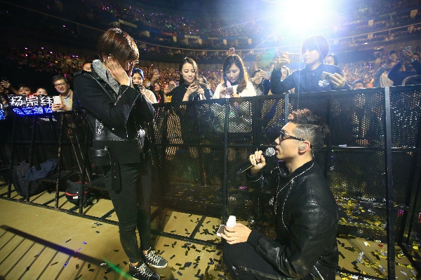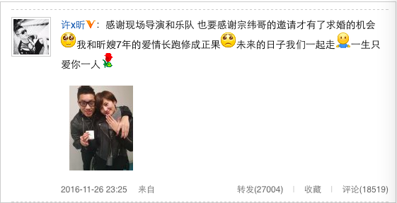 不过,唱着唱着,背景屏幕突然显示为许昕与女友的生活照,并出现字幕:“姚彦,你要嫁给我吗?”现场气氛瞬间高涨,许昕随即拿出准备好的钻戒走向台下女友,并且深情告白:“我们已经相恋七年,我觉得在你最美好的时光一直陪着我,陪着我笑,陪着我哭,陪着我狂,陪着我伤,我一定要做出一些让你知足、满足的事,从现在开始我希望和你共度一辈子,希望你能嫁给我,可以吗? ”