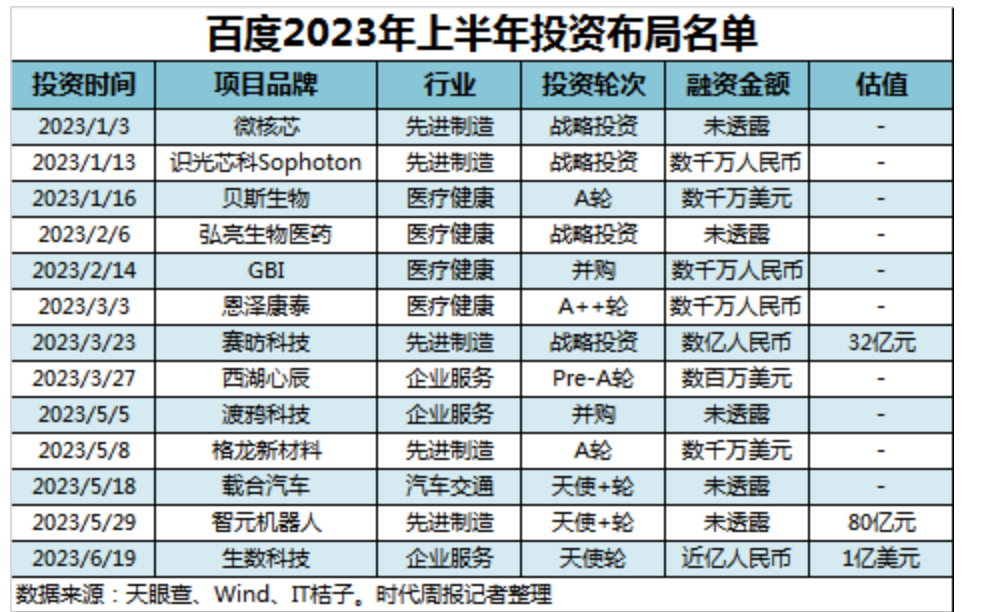 在先进制造领域,百度主要焦距芯片、锂电池、人工智能等领域,先后投资微核芯、识光芯科Sophoton、赛昉科技、格龙新材料、智元机器人。