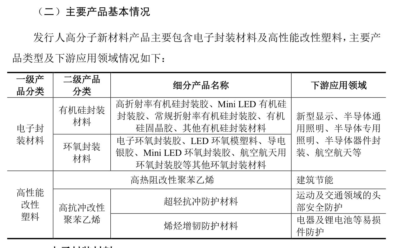 说明书显示,康美特是一家专业从事电子封装材料及高性能改性塑料等高分子新材料产品研发、生产、销售的国家级专精特新重点“小巨人”企业。公司电子封装材料的主要产品形态为LED芯片封装用电子胶粘剂,产品广泛应用于新型显示、半导体通用照明、半导体专用照明、半导体器件封装及航空航天等领域;公司高性能改性塑料的产品形态为改性可发性聚苯乙烯,产品广泛应用于建筑节能、运动及交通领域头部安全防护、电器及锂电池等易损件防护等领域。