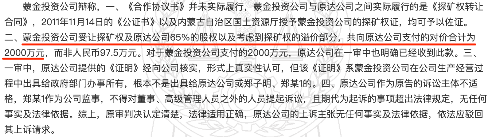 据中国裁判文书网案号为“(2019)内25民终1234号”的终审判决文书显示,彼时和蒙金矿业为同一实控人的内蒙古蒙金矿业投资有限公司(简称“蒙金投资”)在2009年受让内蒙古镶黄旗原达矿业有限责任公司(简称“原达矿业”)的内蒙古自治区镶黄旗加不斯铌钽矿探矿权及原达矿业65%股份,支付交易对价2000万元。2013年8月,蒙金投资将该探矿权转让给蒙金矿业,2014年11月,蒙金矿业经审批后将该矿的探矿权转为采矿权。