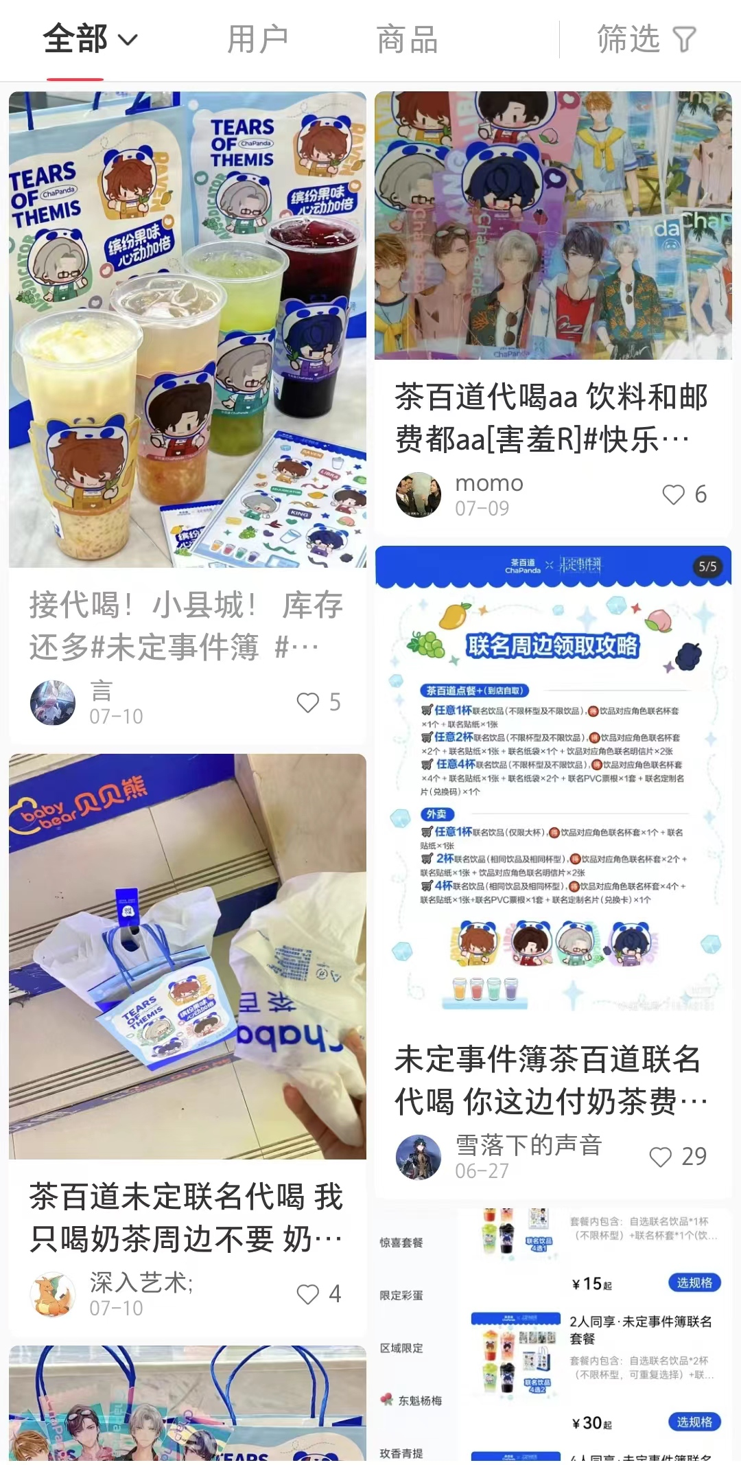 由于门店的区域性限制难以满足粉丝需求,闲鱼和小红书的用户甚至还兴起了代喝业务。需要玩家负责奶茶套餐的费用,代喝者帮买后把全部周边寄给玩家,邮费由代喝者承担。相当于代喝者花低价喝到了4杯茶百道奶茶,而玩家花钱买到一套周边,这波算是各取所需。