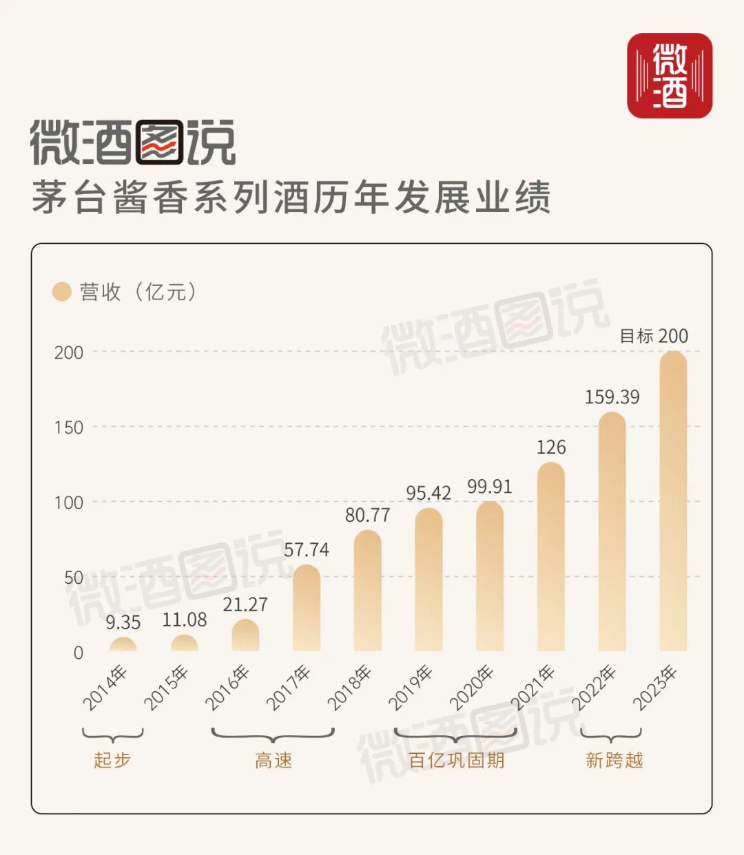 作为茅台的“第二曲线”,系列酒爆发出了惊人的市场速度,甚至远超一些头部酒企。2014-2019年,用6年时间冲到百亿;2019-2023年,再用4年冲到两百个亿。这样的成绩,自然离不开茅台的大力培育和品类热度的加持。