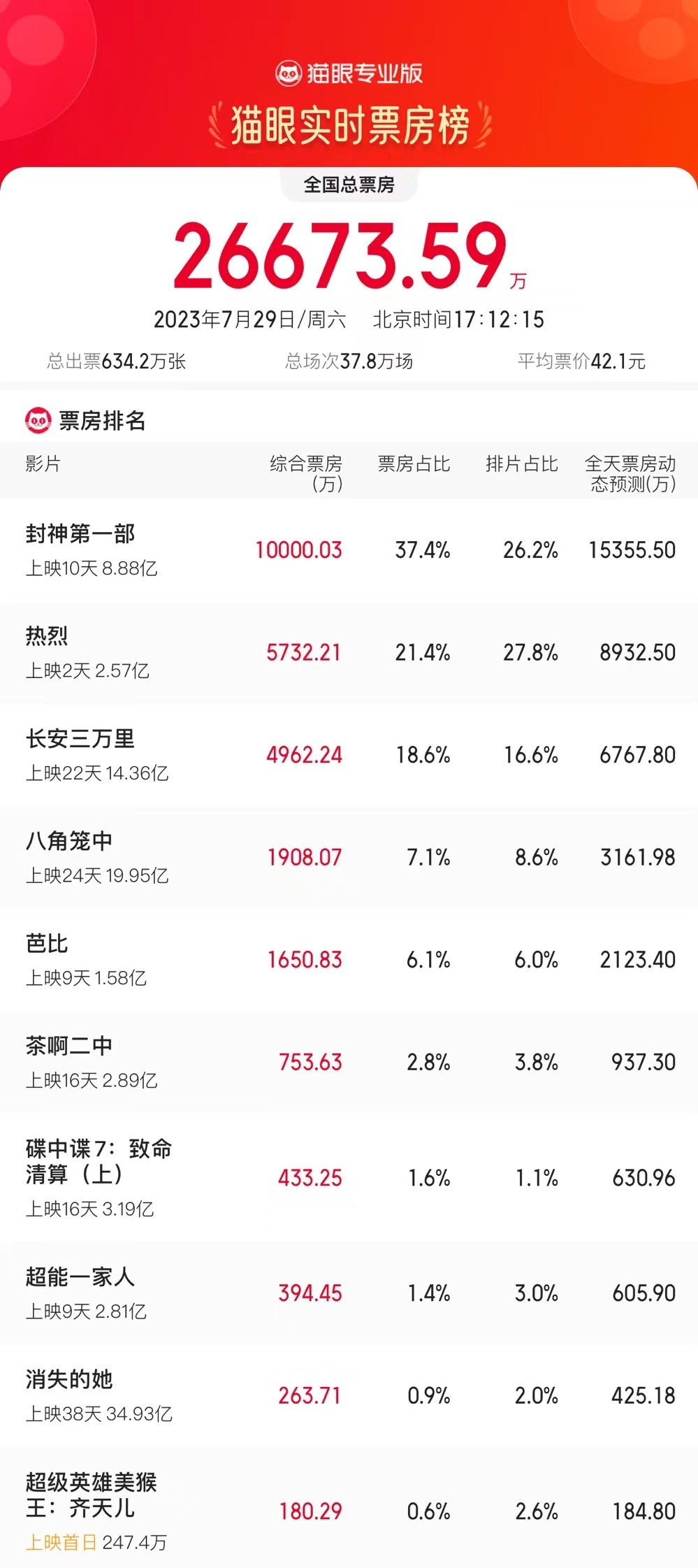 7月29日,据猫眼专业版数据,电影《封神第一部》上映第10天,单日票房突破1亿,截至当前已累计3天单日票房破亿。