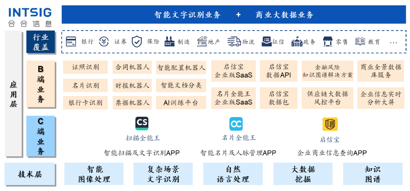 据悉,合合信息C端业务主要为面向全球个人用户的APP产品,包括扫描全能王(智能扫描及文字识别APP)、名片全能王(智能名片及人脉管理APP)、启信宝(企业商业信息查询APP)3款核心产品;公司B端业务为面向企业客户提供以智能文字识别、商业大数据为核心的服务,形成了包括基础技术服务、标准化服务和场景化解决方案的业务矩阵,满足客户降本增效、风险管理、智能营销等多元需求,助力客户实现数字化与智能化的转型升级。
