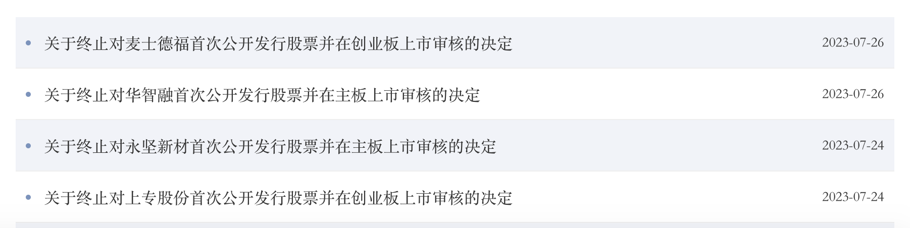 同样,在上周深交所也有IPO公司选择默默撤回自己的首发申请,分别有上专股份(创)、永坚新材(主)、华智融(主)、麦士德福(创)。