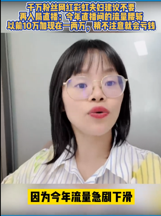 今年5月份,抖音千万粉丝博主彩虹夫妇就发出建议:“普通人不要再入局直播了,以前总是10万加的直播间,现在几乎都是一两万人……稍不注意就会亏钱。”
