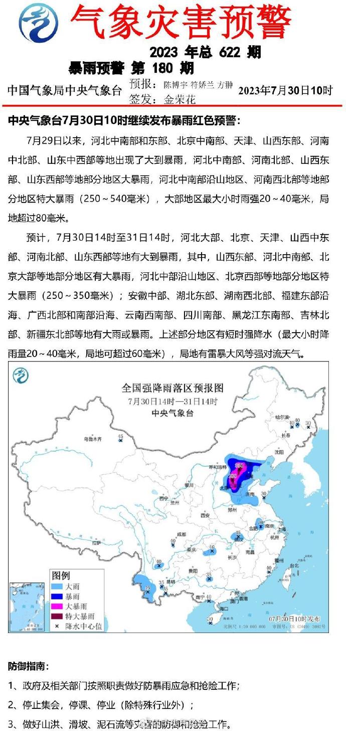 中央气象台7月30日10时继续发布暴雨红色预警。预计,7月30日14时至31日14时,河北大部、北京、天津、山西中东部、河南北部、山东西部等地有大到暴雨,其中,山西东部、河北中南部、北京大部等地部分地区有大暴雨,河北中部沿山地区、北京西部等地部分地区特大暴雨(250~350毫米);安徽中部、湖北东部、湖南西北部、福建东部沿海、广西北部和南部沿海、云南西南部、四川南部、黑龙江东南部、吉林北部、新疆东北部等地有大雨或暴雨。上述部分地区有短时强降水(最大小时降雨量20~40毫米,局地可超过60毫米),局地有雷暴大风等强对流天气。