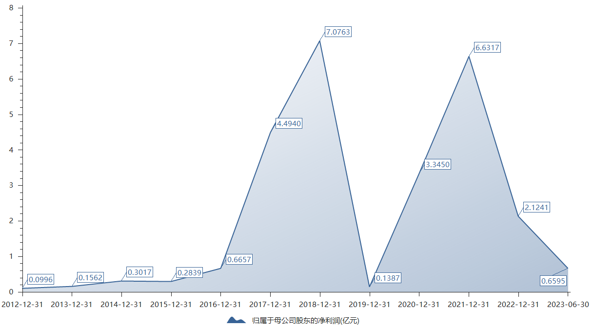 作为资源型周期股,寒锐钴业业绩犹如过山车般剧烈波动。2019年公司归母净利跌入谷底仅为0.14亿元,后经过2年回升于2021年攀至高峰,到达6.63亿元,但在2022年又下滑至2.12亿元。2023年上半年净利继续大降。