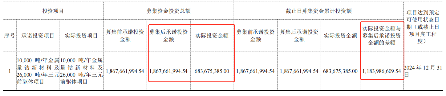 2023年3月31日,公司召开第四届董事会第二十一次会议,审议通过了《关于调整部分募集资金投资项目实施方案进度的议案》,将10,000吨/年金属量钴新材料及26,000吨/年三元前驱体项目整体达到预定可使用状态的时间调整至2024年12月31日。