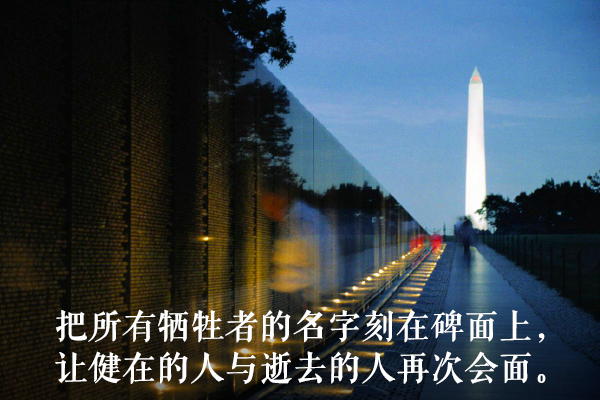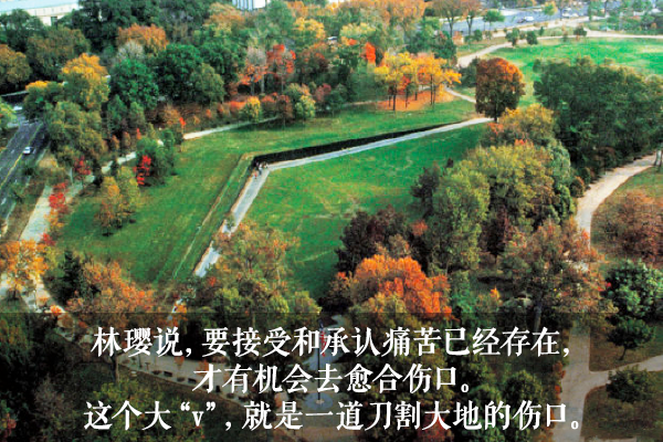 1980年,刚选修“丧葬建筑”课的林璎,在学校告示牌上看见了华盛顿征集“越南战争纪念碑”设计方案的通告,抱着理论结合实践的想法,她在实地考察及大量研究后提出了自己的构想——一个看似将地面割开,既像被埋在地平线下,也像从地里向上生长的,以大“V”字形,分别向林肯纪念堂和华盛顿纪念碑展开的纪念碑,其碑体以黑色花岗岩为材料,碑面则用来雕刻战争牺牲者的名字。