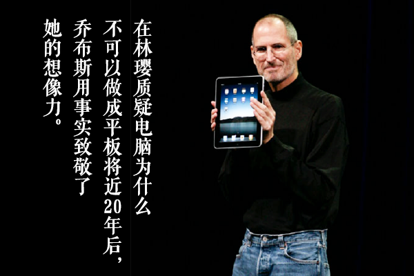 林璎回忆,那期间,她和乔布斯一起工作了一个星期。“我问他,为什么电脑看上去就像笨重的电视机?为什么你们不把它做得薄一点儿?为什么不做成平板的便携式电脑?”乔布斯想了想回答说,那将是他的目标。