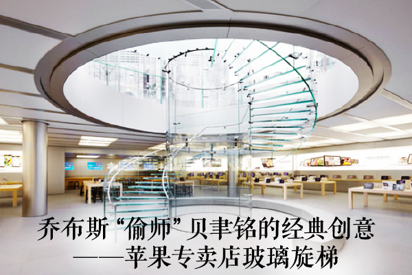 乔布斯离开苹果创办NeXT之后,曾修建一栋全新的大楼。为让大楼非同寻常,他邀请贝聿铭在大堂中心设计了像漂浮在空中一样的一架宏伟的螺旋楼梯,后来,乔布斯把它偷师到了苹果专卖店的设计中,也就是今日苹果专卖店最引人瞩目的玻璃旋梯。或许是太爱这个创意,乔布斯还将其申请成了自己持有的专利。