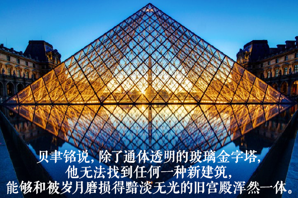 1981年,法国推出巴黎卢浮宫重建计划,其总统弗朗索瓦•密特朗邀请全球15位知名博物馆馆长向他们推荐设计师,被13位馆长一致推荐的贝聿铭,直接被指定为了项目设计师,这也是法国唯一一项没有通过竞争,就直接指定建筑师来设计的国家工程。而贝聿铭则以一个通体透明的玻璃金字塔设计惊艳了整个世界,并在项目竣工时被密特朗总统授予了法国最高荣誉奖章。
