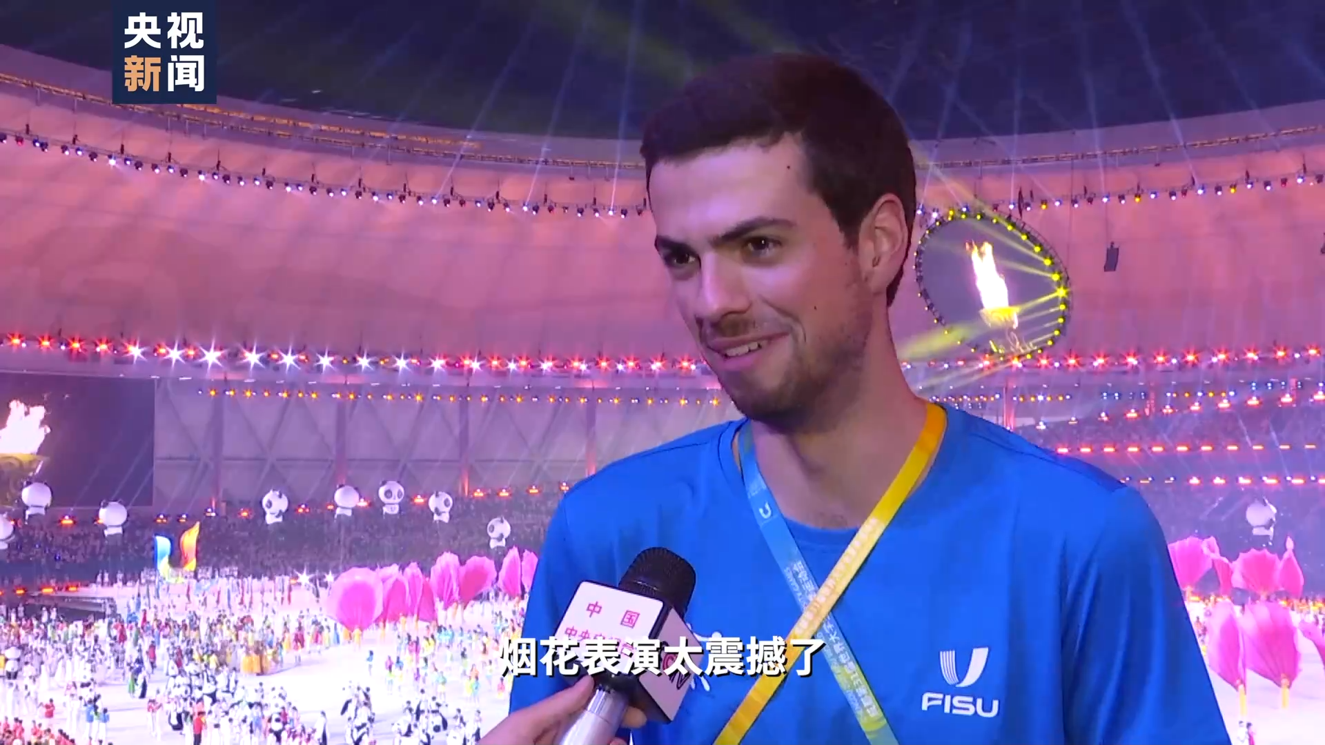巴西卡斯帕 里贝罗大学新闻学专业大三学生 成都大运会青年记者 康利 佩德罗:这是我见过的最惊艳的开幕式。烟花表演太震撼了。我要向全世界展示这个大运会开幕式是多么令人惊叹,接下来的比赛将会如何精彩。