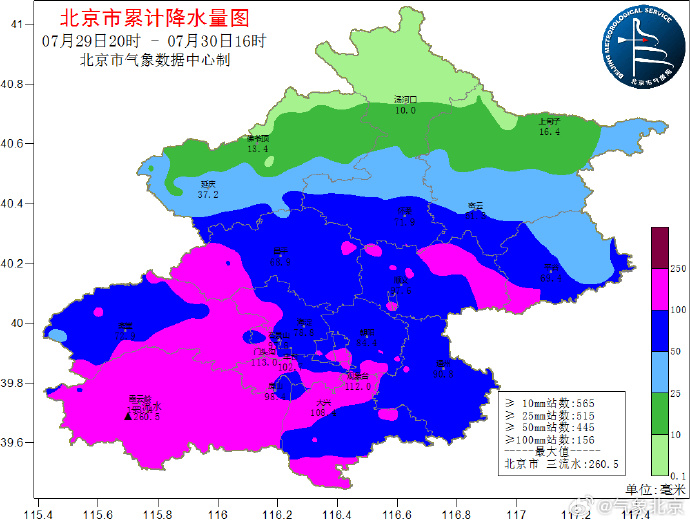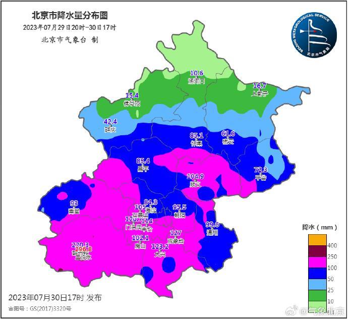 根据气象部门统计,从29日20时至30日17时,北京地区全市平均降雨量89.6毫米,城区平均102.4毫米;最大降雨出现在房山三流水,296.8毫米;最大小时雨强出现在顺义北石槽,30日6时至7时降雨量41.7毫米。