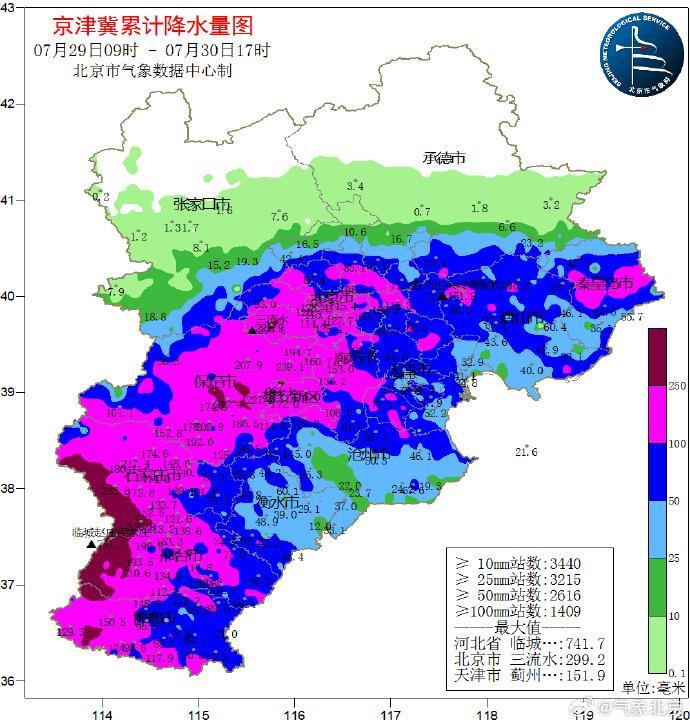 在京津冀区域,从29日9时至30日17时,京津冀地区最大降雨出现在邢台市临城赵庄梁家庄,为741.7毫米,最大小时雨强出现在廊坊市霸州东段,30日2时至3时降雨72.5毫米。