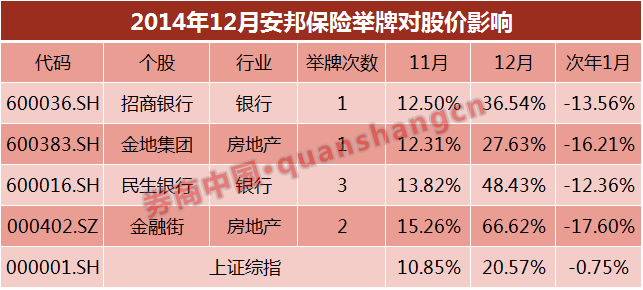 2014年12月,安邦保险集团对招商银行、金地集团、民生银行和金融街等4只个股合计发起了7次举牌,4个股12月单月平均涨幅达到44.81%,较上证指数的同期涨幅高出24.24%。其中,金融街因陷入安邦保险和生命人寿的股权争夺战而遭遇连番举牌,2014年12月单月涨幅达到66.62%,较上证指数的超额收益达到46.05%。