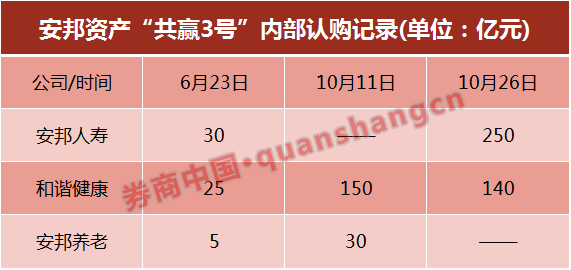 相比于调入“共赢3号”的资金动辄百亿,安邦集团在调入其他资产管理产品的力度就没那么大了。公告显示,安邦人寿在7月27日认购了“共赢2号”3亿元,安邦养老和安邦人寿在10月13日分别认购“价值精选1号”3400万元和100万元。