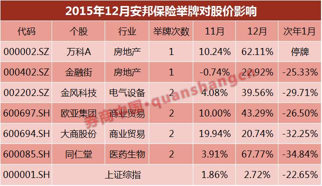 熊市下也不例外。2015年12月,安邦保险再次发起密集举牌,一个月内对6只个股发起10次举牌,不论是投资频次还是力度都较上一年有所增加,6只个股平均单月涨幅达到42.73%,其中同仁堂当月涨幅达到67.77%。相较之下,上证指数同期涨幅只有2.72%。