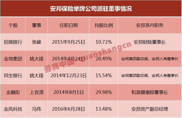据券商中国记者统计,2013年以来,安邦保险共对9家上市公司进行了举牌(不包括中国建筑和山东高速),目前已经对其中5家上市公司派驻了董事,其中民生银行、金融街和金地集团都是在2014年派驻,招商银行是在2015年派驻,去年举牌的金风科技则是在2016年派驻。