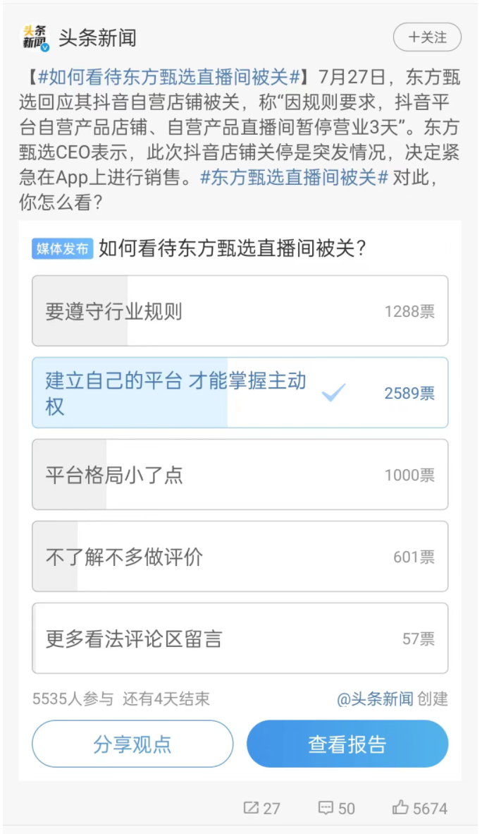 这波“你来我往”中,最终东方甄选貌似赢麻了——从带货GMV来看,7月27日,东方甄选APP销售额突破3000万元,创历史新高,是当日东方甄选抖音直播间GMV约的三四倍;从用户舆情来看,关停事件冲上微博热搜,相关话题阅读量破亿,多数网友抱着同情弱者的心理,力撑东方甄选,带动其APP登上iOS购物榜单第一名;再从资本市场来看,东方甄选单日股价上涨了近三成。