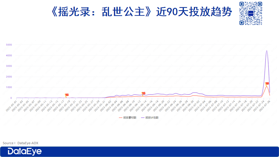 DataEye-ADX投放数据显示,《摇光录:乱世公主》在五月底才开始投放,整体预热阶段投放量不高,在未上线前日均投放保持在100组左右。公测前一天《摇光录:乱世公主》加大素材投放,素材量至530组,7月25日公测当天投放量大幅度飙升,达到839组。