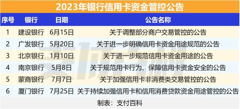 「支付百科」整理各家银行公告发现,今年以来已有多家国有大行、股份制银行、城商行相继发布了关于严控信用卡资金流向的相关公告,银行对信用卡业务的规范正逐步加严。