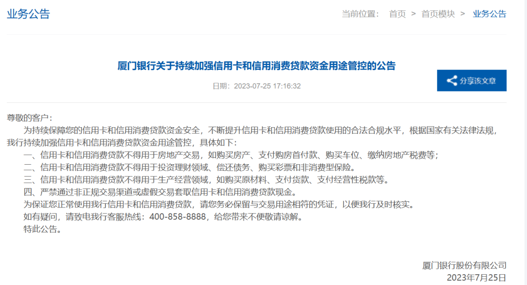公告显示,厦门银行表示,信用卡和信用消费贷款不得用于房地产交易,如购买房产、支付购房首付款、购买车位、缴纳房地产税费等;不得用于投资理财领域、偿还债务、购买彩票和非消费型保险;不得用于生产经营领域,如购买原材料、支付货款、支付经营性税款等;严禁通过非正规交易渠道或虚假交易套取信用卡和信用消费贷款现金。