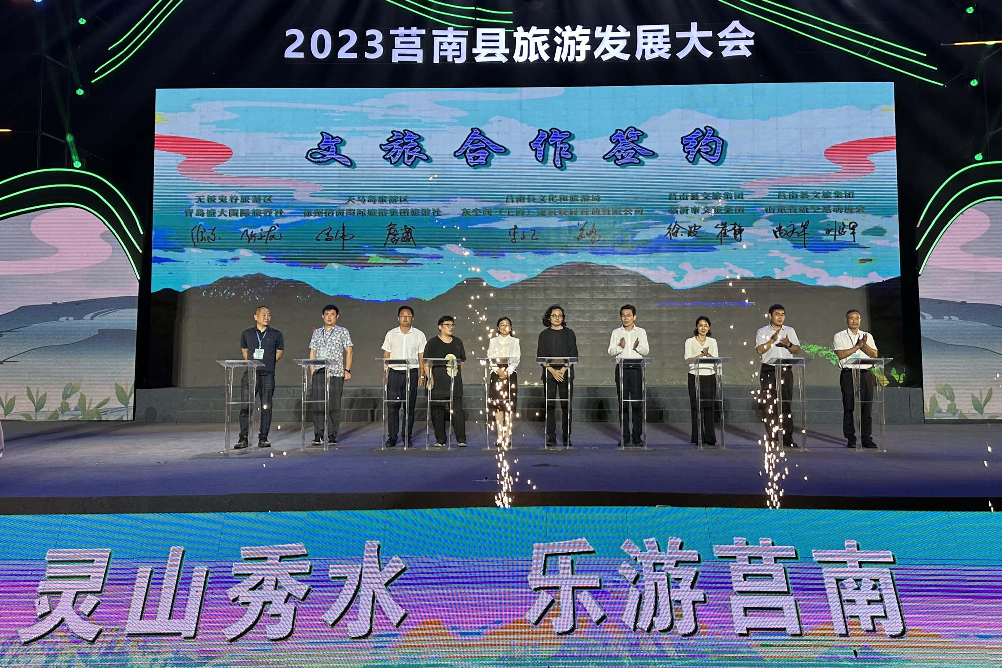 会上,莒南县委书记、临沂临港经济开发区党工委书记黄慧林,临沂市政府副市长王映海,中国东夷文化研究会会长、山东省旅游行业协会副会长丁再献,山东省委宣传部副部长、省电影局局长程守田先后作了致辞。县委副书记、县长厉伟对莒南精品旅游资源及旅游线路进行了推介。随后,王言彬、庄子健、尤元文、王世农、程守田、张晓彬、王映海、朱海舰、黄慧林、厉伟为天马岛旅游区、庄氏庄园、茶溪川旅游区、永锋钢铁文化工业园、厉家寨展馆、高家柳沟展馆、战时兵工厂、英雄曹玉海展馆开业启动,并共同启动2023莒南县旅游发展大会。