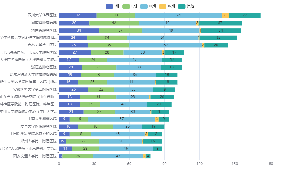 四川大学华西医院是开展临床试验最多的机构,项目数为173项,Ⅲ期临床74项。