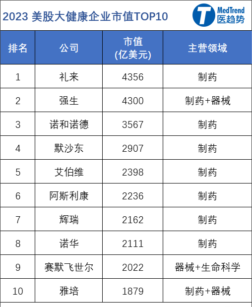 从2023年最新TOP10市值来看,排名前三:礼来、强生、诺和诺德。诺和诺德、礼来都是纯药企,而礼来更是几乎以“空降”姿态位居全球大健康市值TOP1。