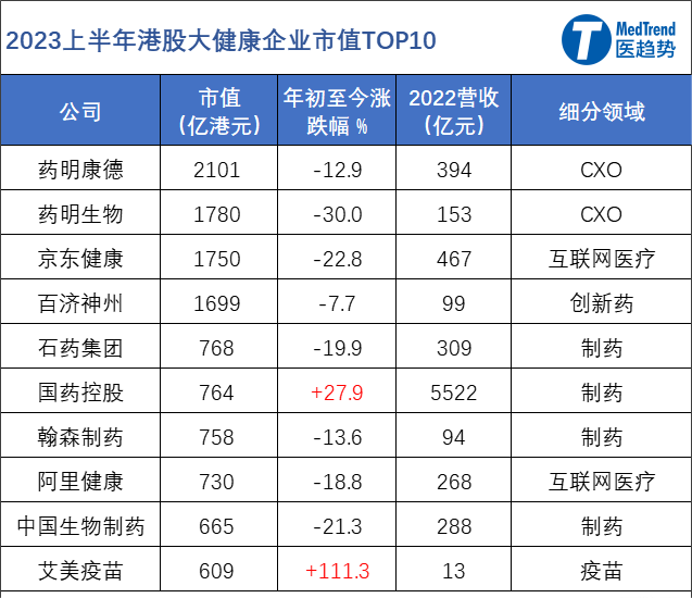港股大健康市值TOP10,仅国药+27.9%、艾美疫苗+111%;其他都下跌。跌幅前三:药明生物-30%,京东健康-23%,中国生物制药-21%。