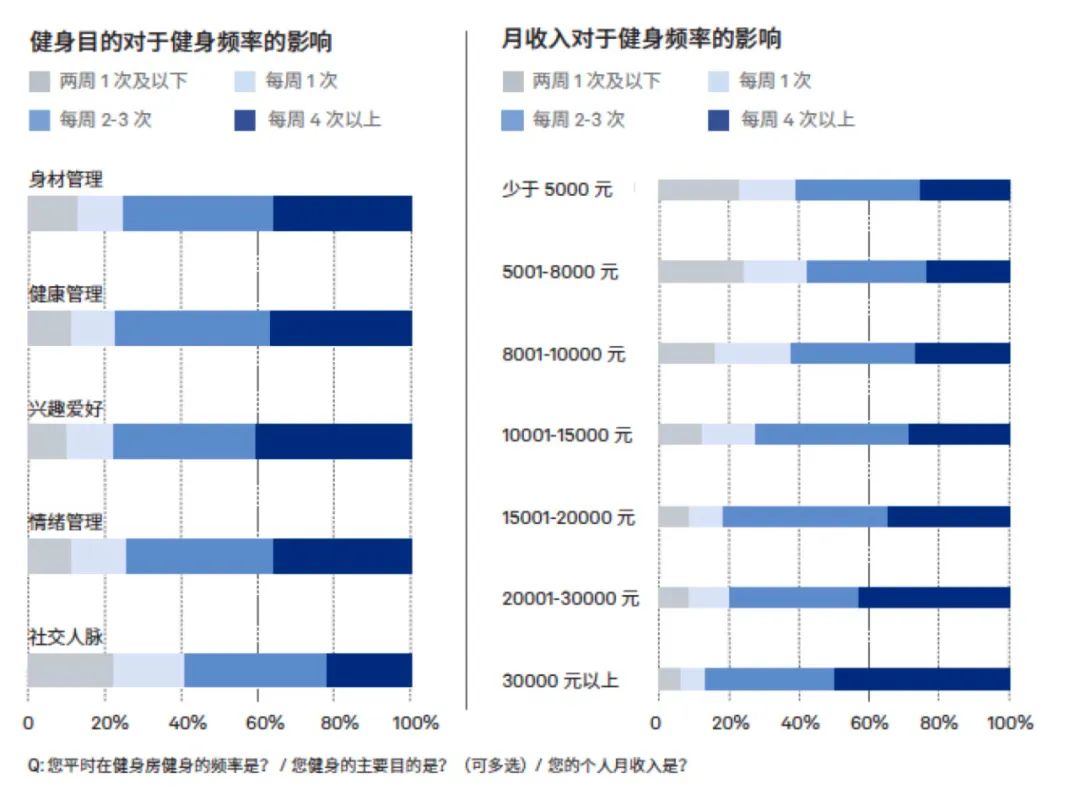 比如,根据报告,收入越高的群体,健身频率往往是越高的;而健身目的越来自于内发动机,健身频率也是越高的。