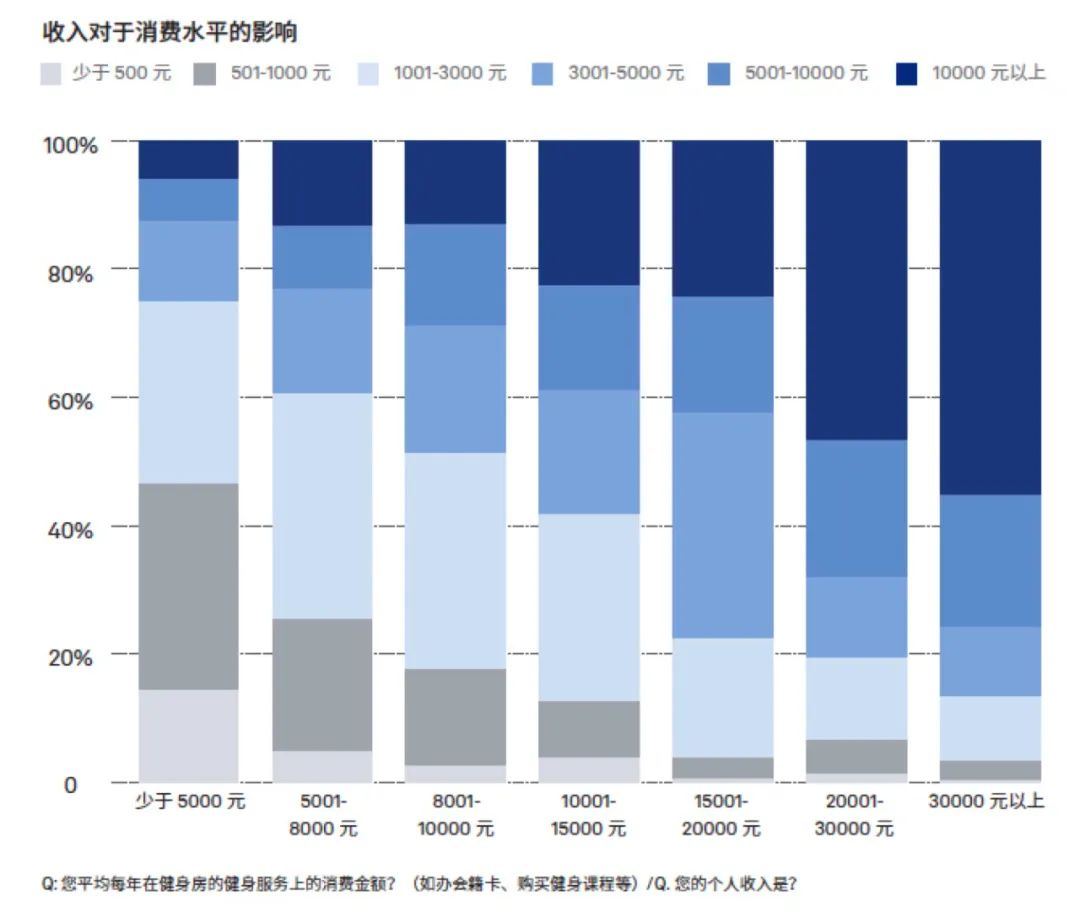根据精练GymSquare发布的《2022中国健身行业报告》,月薪超过1万5的健身爱好者,年健身消费超过3000元的占比大幅度提高(从19.4%到35.1%)。