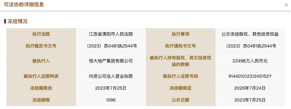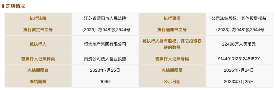 国家企业信用信息公示系统网站显示,7月25日,广州足球俱乐部股份有限公司新增两则股权冻结信息,被执行人均为恒大地产集团有限公司,冻结股权数额均为2.24亿余元,冻结期限自2023年7月25日到2026年7月24日,执行法院为江苏省溧阳市人民法院。