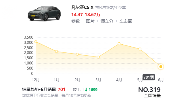 最先遭殃的是雪铁龙。在今年三月凭借最低打五折的促销短暂回暖后,雪铁龙销量重回常态,今年六月,其全系总销量仅为1101辆,“唯一希望”凡尔赛C5X今年6月销量为701台,一年来首次销量跌破一千。