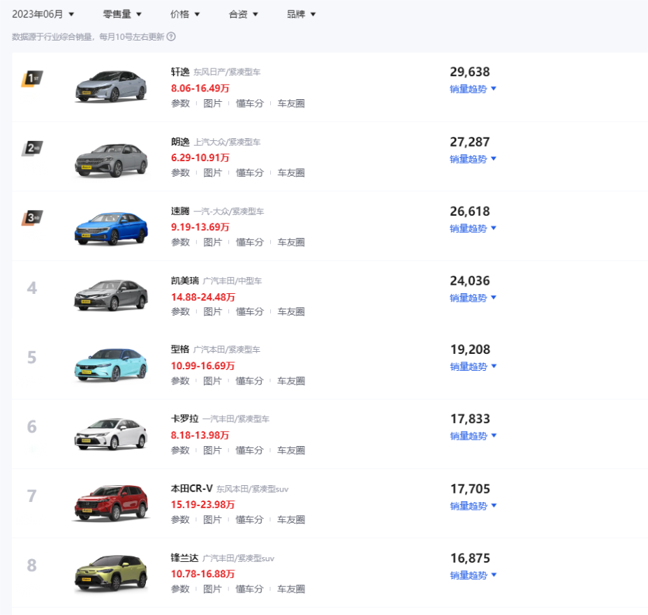 汽车流通协会数据显示,今年6月销量排行,轿车领域仍然被合资燃油车霸榜。特别是在A级轿车领域,日系三杰和大众还是领头羊。前十五名中,日系三杰和大众占了7个,其中日产的轩逸和大众的朗逸、速腾三款车型牢牢占据着前三名的位置。